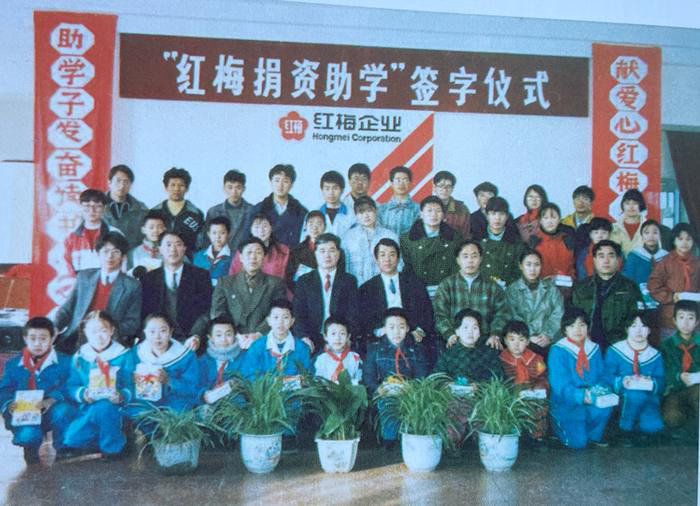 1996年红梅企业资助辽宁大学等六所大学、保工一校等三所小学的贫困学生读书。