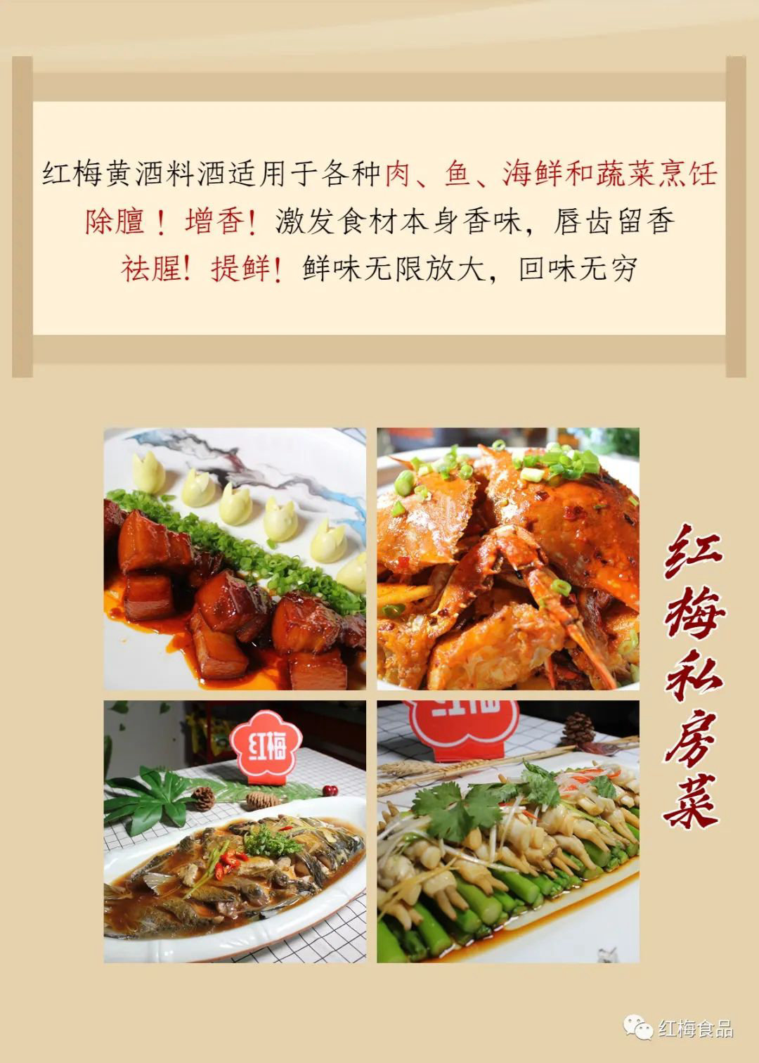 红梅黄酒料酒,纯粮食酿造, 红曲发酵,零添加防腐剂, 无酒精勾兑,不添加食用盐! 增香提鲜,食安健康!