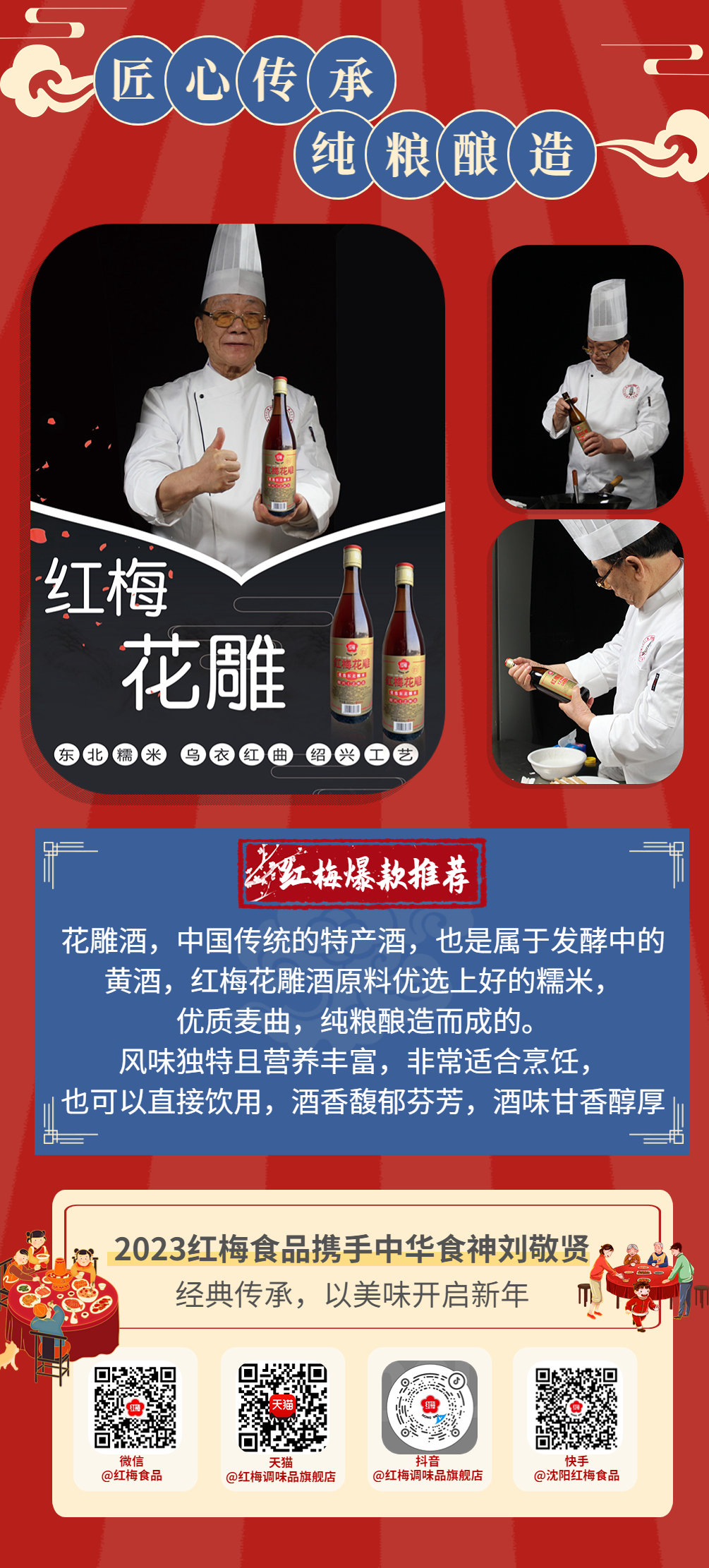 刘敬贤大师表示:“红梅花雕纯粮食酿造,无任何添加剂,味道也非常好,花雕酒在烹饪肉类和鱼类菜品时祛腥除膻、增香解腻的效果都非常好,而且纯粮酿造的花雕酒,酒色如琥珀,烹饪的时候可以为菜品增添亮色,烹调出的菜品色泽鲜亮、松嫩可口同时香气四溢。非常适合各大餐饮企业、饭店后厨使用。”