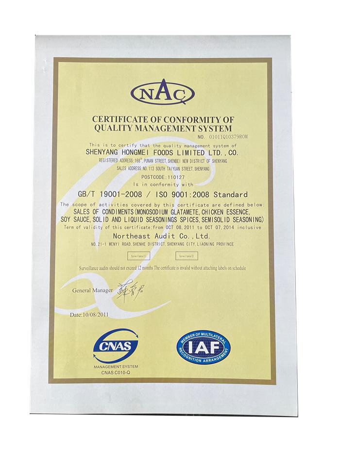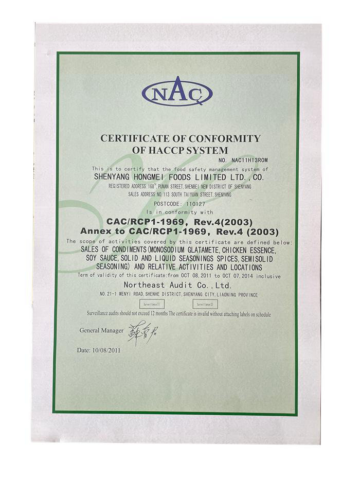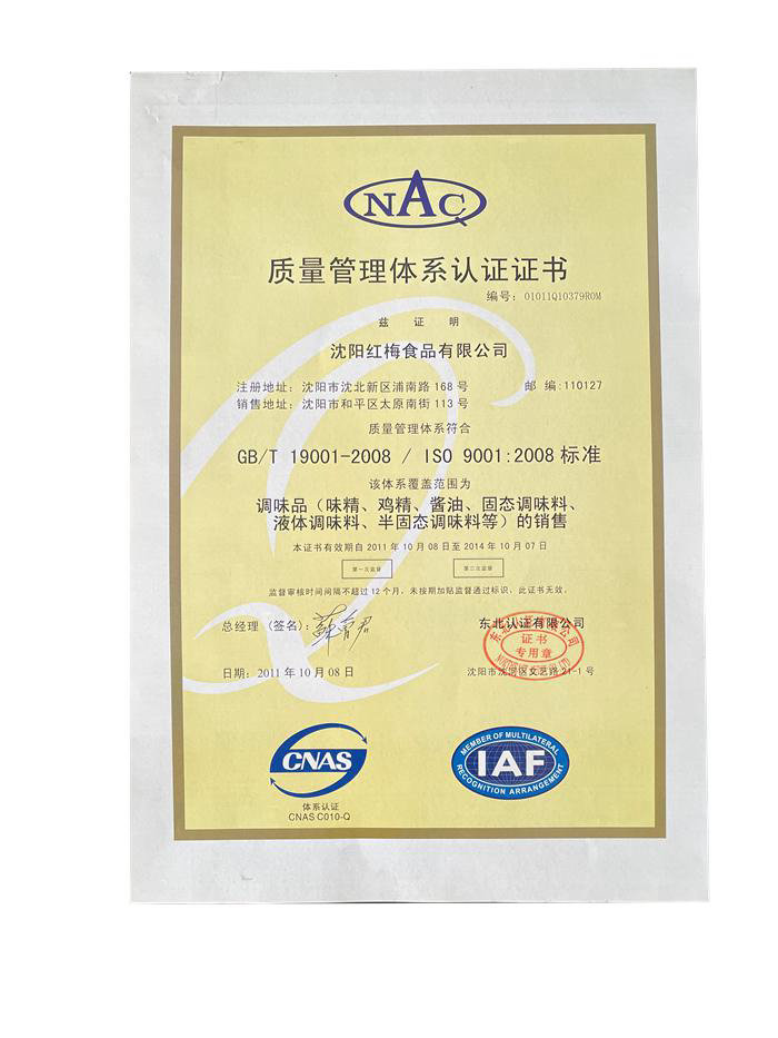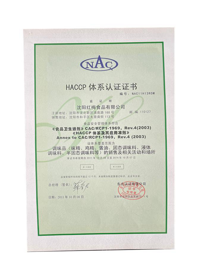 2011年8月,沈阳红梅食品有限公司正式投产,同时获得《食品安全管理体系认证证书》、《危害分析与关键点控制HACCP的认证证书》。公司对每年的质量认证企业都非常重视。